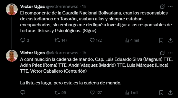 “El componente de la Guardia Nacional Bolivariana, eran los responsables de custodiarnos en Tocorón, usaban alias y siempre estaban encapuchados; sin embargo me dediqué a investigar a los responsables de torturas físicas y psicológicas”, escribió Ugas en la red social.