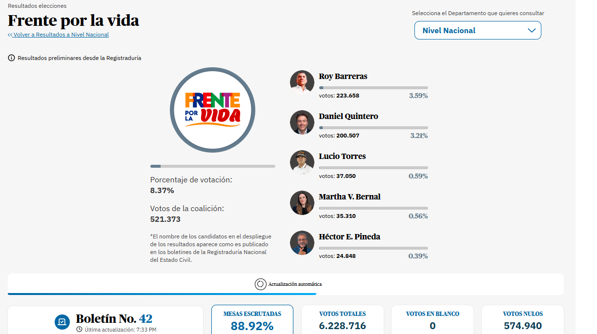 Con cerca del 94 % de las mesas escrutadas, Barreras, del movimiento ‘Solo con Roy ganamos todos’, acumulaba 239.165 votos, mientras que el segundo lugar fue para el exalcalde de Medellín Daniel Quintero, que obtuvo con 214.992 papeletas.