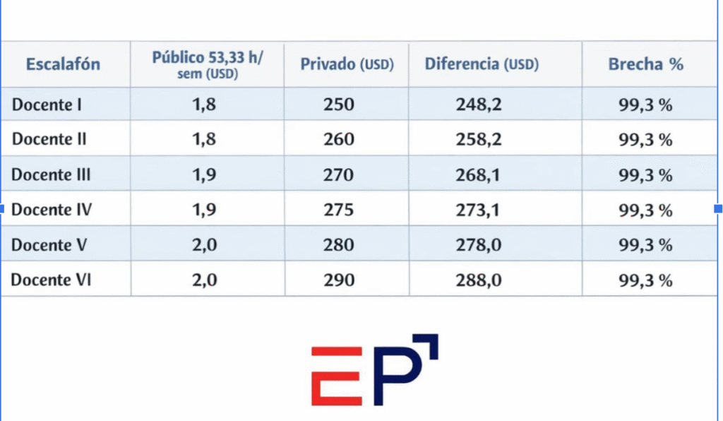 Los datos muestran los salarios mensuales aproximados de docentes públicos según escalafón y jornada, comparados con el promedio del sector privado. La columna de “Brecha %” indica cuánto más gana un docente privado frente a uno público, evidenciando la gran diferencia de ingresos y la precariedad del salario en la educación pública venezolana.
