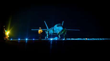 El Mando Central de EE.UU. (CENTCOM) publicó este martes una foto del momento en que un caza furtivo F-35B se prepara para alzar vuelo desde un buque de asalto anfibio, el USS Tripoli (LHA 7), que navega en el mar Arábigo. La nave toma parte en el bloqueo del estrecho de Ormuz, impuesto por Donald Trump para cerrar el paso a las embarcaciones que entran y salen de puertos iraníes.