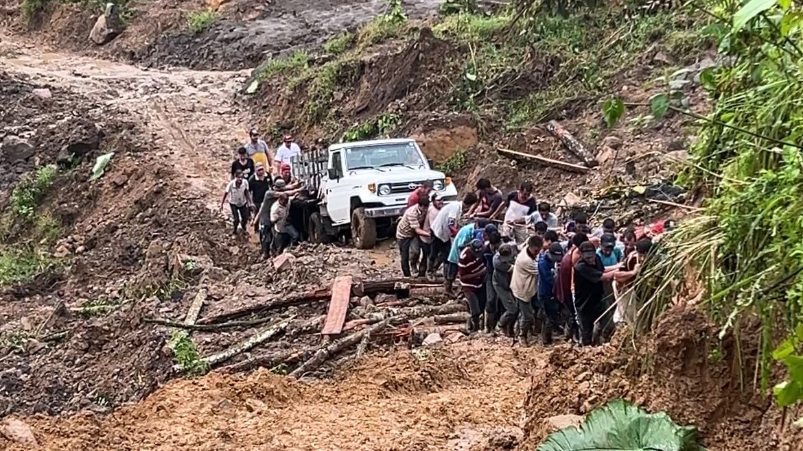 Desde entonces, estas personas esperaban poder recuperar sus enseres, vehículos y animales que quedaron del otro lado de este derrumbe. No fue sino hasta este sábado 11 de abril en horas de la tarde-noche cuando lograron hacerlo. Con el apoyo de más de 40 hombres de comunidades vecinas, engancharon sus camiones a unas sogas para ser remolcados entre la montaña.