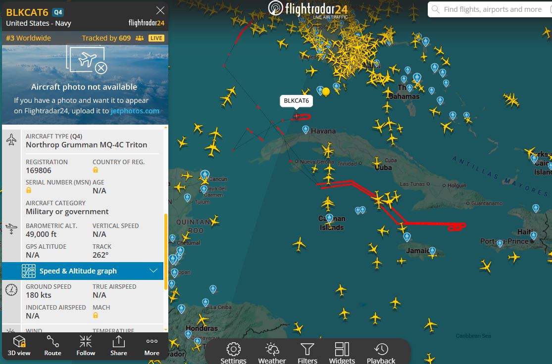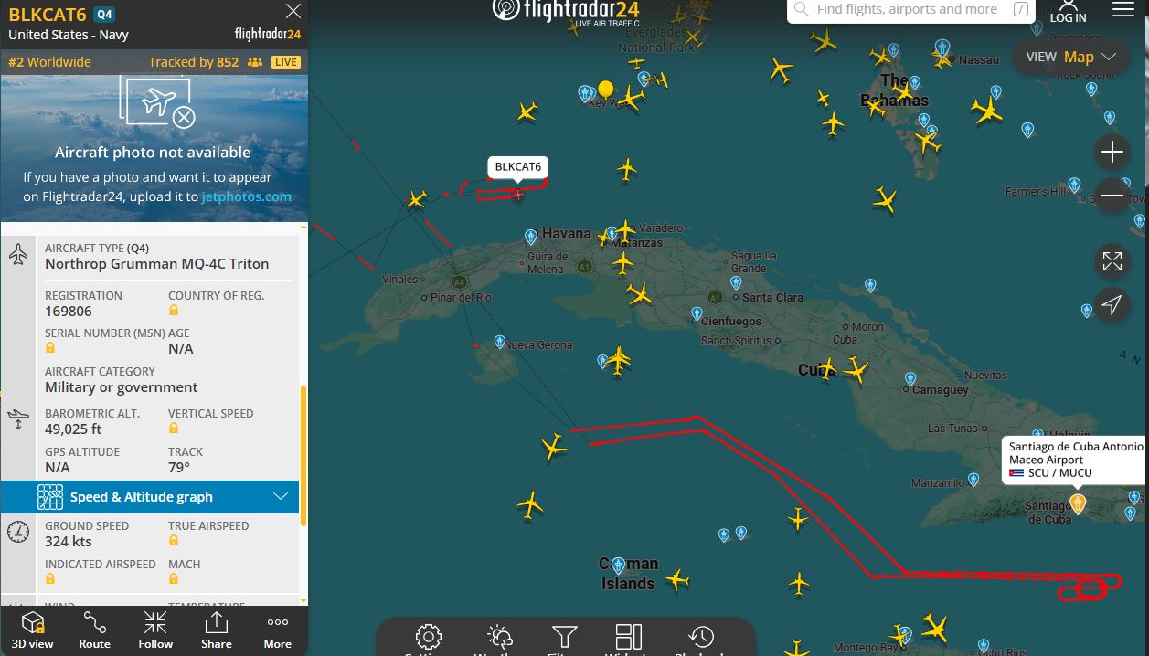 Durante horas, el Triton bordeó las costas cubanas en un recorrido estratégico. Alrededor de las 9:00 pm., el dron se encontraba realizando maniobras de patrullaje a una altitud de 49,000 pies muy cerca de La Habana, el centro del poder político del régimen de Miguel Díaz-Canel.