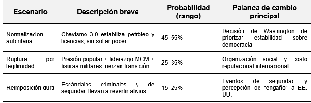 | Normalización autoritaria | Chavismo 3.0 estabiliza petróleo y licencias, sin soltar poder | 45–55% | Decisión de Washington de priorizar estabilidad sobre democracia |