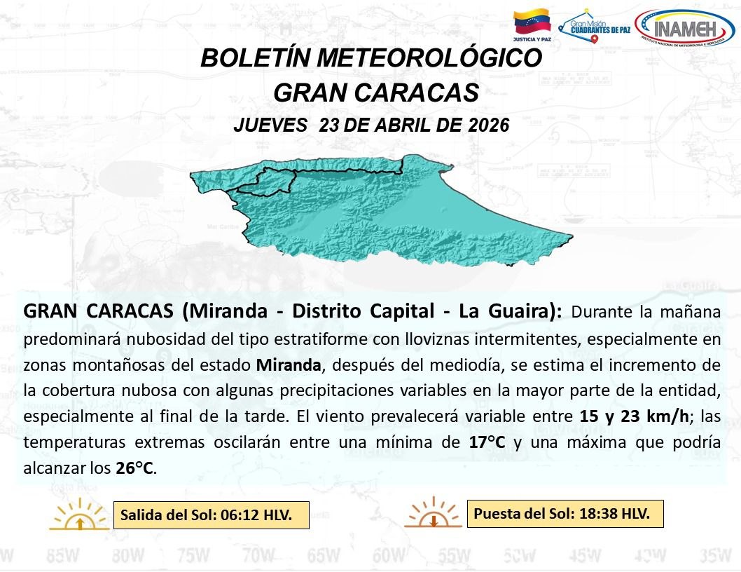 El Inameh también alerta que desde la mañana de este lunes hasta el mediodía, se espera la presencia de lloviznas constantes en la Gran Caracas, principalmente en las áreas montañosas del estado Miranda.