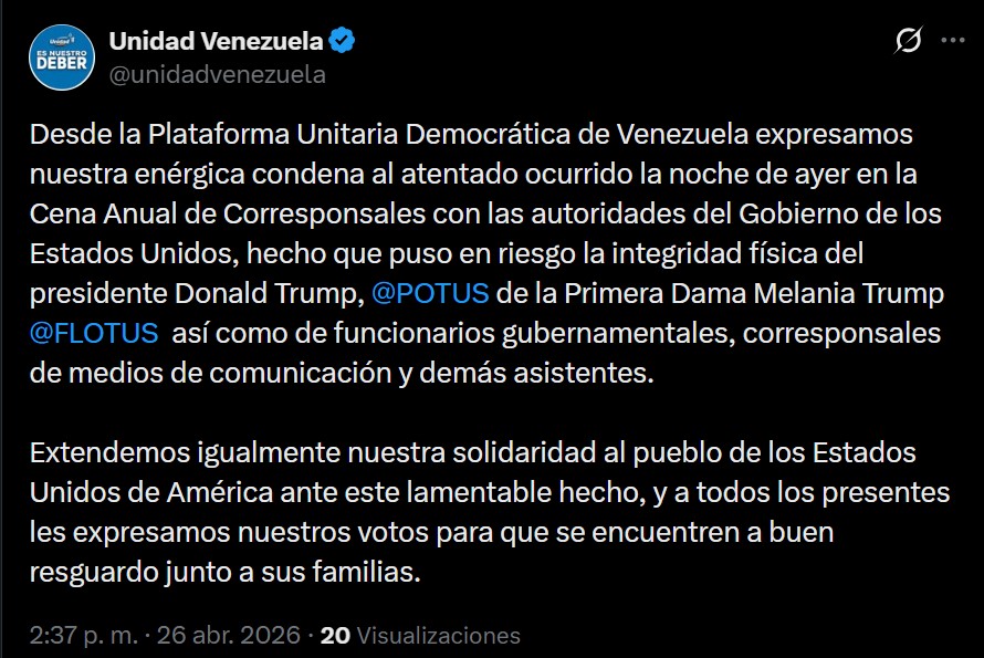 La Plataforma Unitaria Democrática de Venezuela expresó este domingo su rechazo al atentado ocurrido durante la cena anual de corresponsales en Estados Unidos, hecho que obligó a evacuar al presidente Donald Trump y a otros asistentes.
